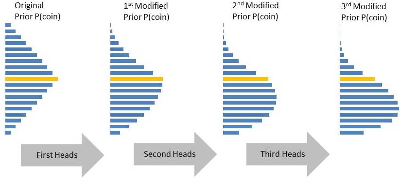 By the end of the 3rd experiment you are almost 93% sure that you have a coin that resembles Coin 2. The above example is a special case since we have considered just two coins. However, for most practical problems you will have factories that produce coins of all different biases (remember toss of coin is a synonym for the more practical problems we have discussed above). In such cases the prior probabilities will be a continuous distribution (a case for triangle distribution as shown below). Notice with the results of each experiment how bulge is shifting toward coins that are more likely to produce heads. Keep in mind the orange bar in the figure below is for the unbiased coin i.e. 50/50 chances for heads and tails.